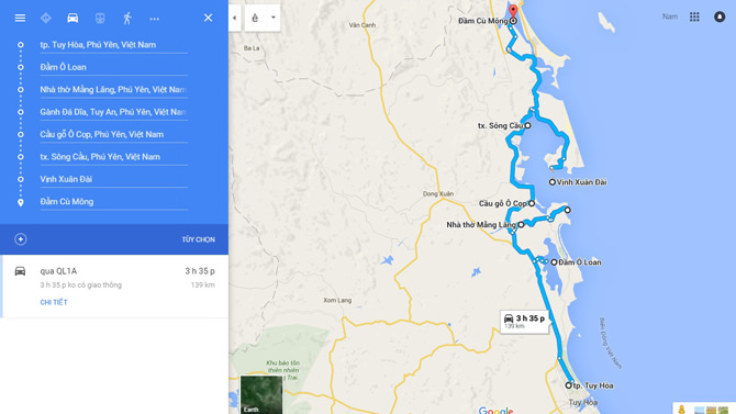 Lịch trình lý tưởng: Thành phố Tuy Hòa - Quốc lộ 1A - Đầm Ô Loan - Nhà thờ Mằng Lăng - Gành Đá Đĩa - Cầu gỗ Ông Cọp - Thị xã Sông Cầu - Vịnh Xuân Đài - Đầm Cù Mông - Đèo Cù Mông.