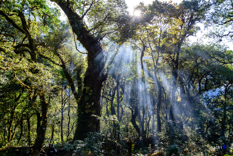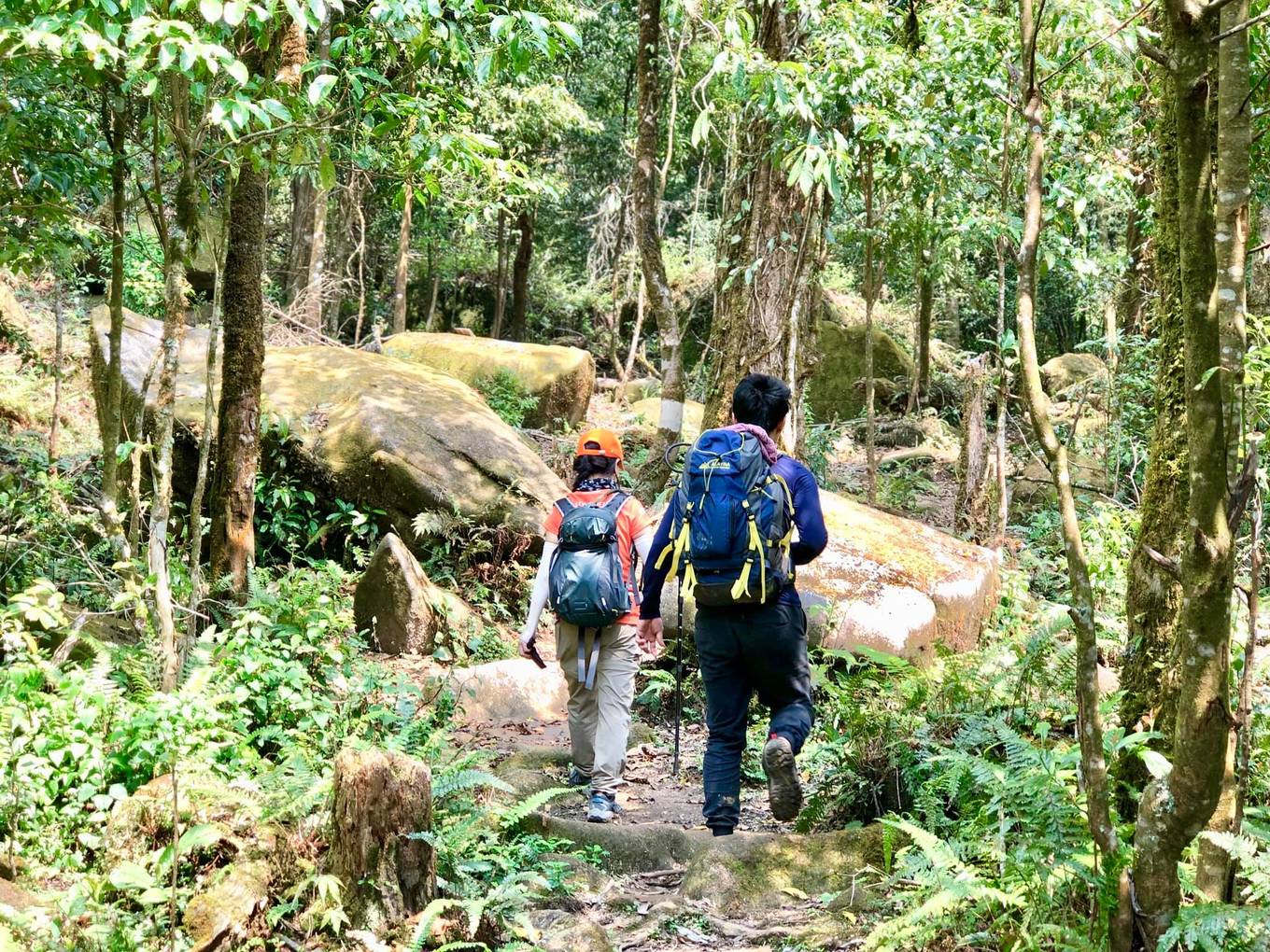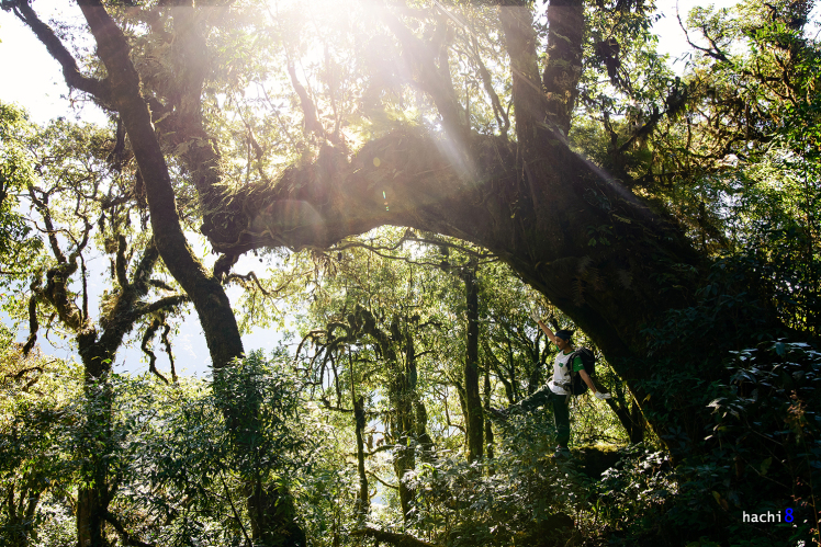Càng vào sâu trong cánh rừng già, càng thấy rõ những cây cổ thụ với tán lá xum xuê, thân to lớn mà rêu phong và dương xỉ phủ kín. Rêu bám đầy từ những phiến đá lớn xếp chồng với đủ hình thù kỳ dị cho tới những thân cây to vươn mình ngạo nghễ. Cây leo cũng bám chằng chịt lên phiến đá. Trông chúng chả khác gì những xúc tu của một loài động vật lạ, sẵn sàng vươn mình nuốt trọn kẻ vượt núi tìm rừng. Chúng tôi cũng hết sức bất ngờ khi thấy thật nhiều những thân cây cổ thụ rỗng tếch, phía trong lòng cây đã xanh thắm màu rêu. Nắng chiếu xiên qua phiến lá, rêu càng xanh và càng tinh khôi trong ánh nắng rừng thơm tho.