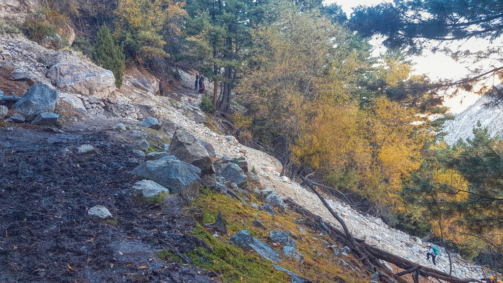 Từ cầu Raikot đến Beyal Camp, hành trình của tôi chia thành nhiều chặng. Đầu tiên, cả nhóm di chuyển bằng xe Jeep đến trại Fairy Meadows ở độ cao 3.300 m. Con đường chúng tôi đi qua nhỏ xíu, đầy sỏi đá và rất dốc. Với một bên là vực sâu thăm thẳm, đường dằn xóc, uốn lượn quanh triền núi.