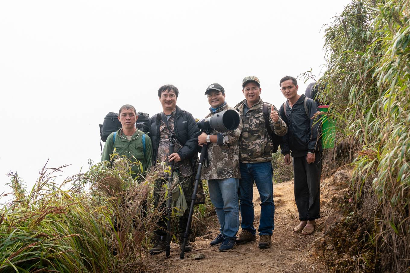 Đầu tháng 4, nhiếp ảnh gia Thuần Võ (thứ hai từ trái sang) cùng các đồng nghiệp Nguyễn Mạnh Hiệp, Phạm Hồng Phương trải nghiệm quan sát, ghi nhận loài và săn ảnh các giống chim quý tại Fansipan thuộc Vườn quốc gia Hoàng Liên (Lào Cai và Lai Châu). Chuyến đi có sự hỗ trợ của anh Nguyễn Hào Quang, hướng dẫn viên chuyên về quan sát chim cùng các "thổ địa" dân tộc Mông. Ảnh: Nguyễn Hào Quang.
