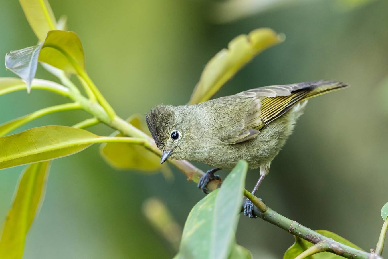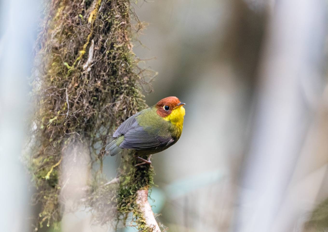 Loài khướu mỏ dẹt vàng có kích thước nhỏ bằng ngón tay cái, nhanh và di chuyển liên tục. Đây là loài chim đẹp, không dễ gặp của núi rừng Tây Bắc. Các thành viên trong nhóm cho biết họ hồi hộp khi thấy loài chim này nên những bức ảnh đầu tiên đều không ưng ý. Ảnh: Nguyễn Mạnh Hiệp.