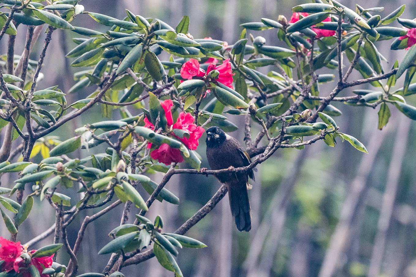 Chim khướu mặt đen đậu trên cành hoa đỗ quyên. Ảnh: Thuần Võ.