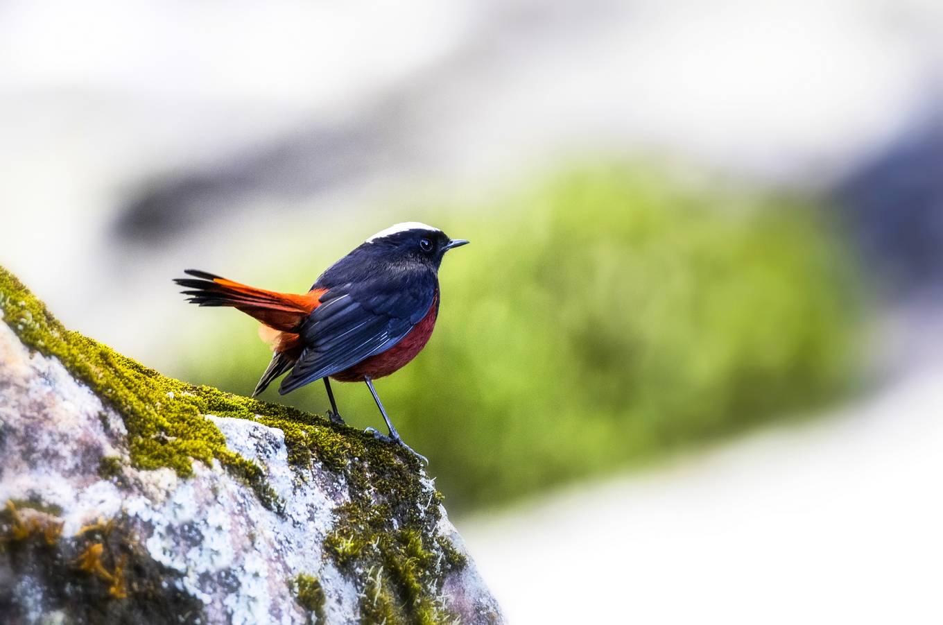 Những người đi săn ảnh chim đòi hỏi đầu tư về thiết bị chụp, phải có kinh nghiệm leo núi và đi rừng. Ống kính đặc thù chụp chim dao động 400 mm - 600 mm. Nhưng đối với địa hình hiểm trở, cần ống kính cơ động, gọn nhẹ, do đó khi chụp chim tại Fansipan, nhiếp ảnh gia thường chọn ống kính loại fix 600 mm hoặc ống zoom 150 mm - 600 mm, 200 mm - 500 mm để thuận tiện cầm tay khi di chuyển. Trong ảnh là loài đuôi đỏ đầu trắng, sống chủ yếu ở khu vực núi cao và ít khi bay xa khỏi nơi ở, hiếm gặp. Ảnh: Phạm Hồng Phương.
