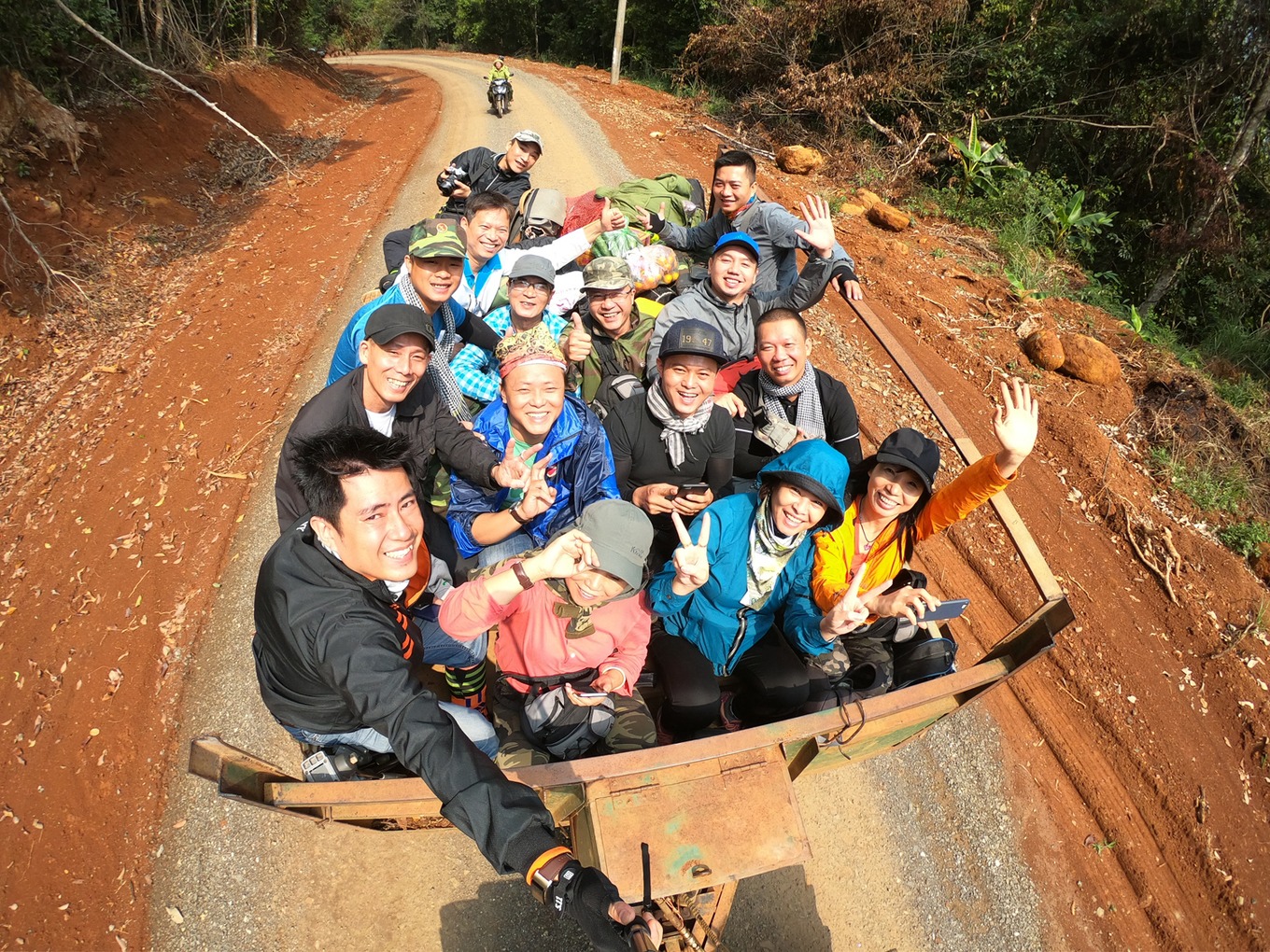 Xe máy cày chuyên dụng chở đoàn có thể “càn quét” mọi chướng ngại vật trong đường băng rừng hiểm trở. Ngồi trên xe di chuyển gập ghềnh là một trong những khoảnh khắc ấn tượng nhất cuộc hành trình.