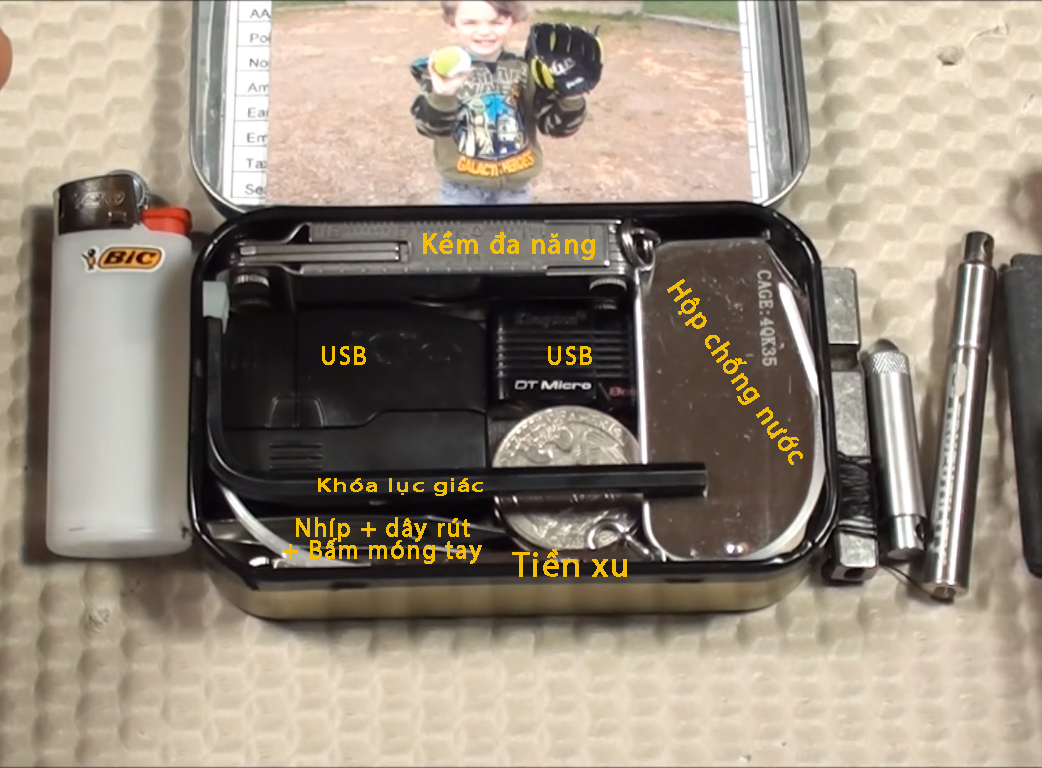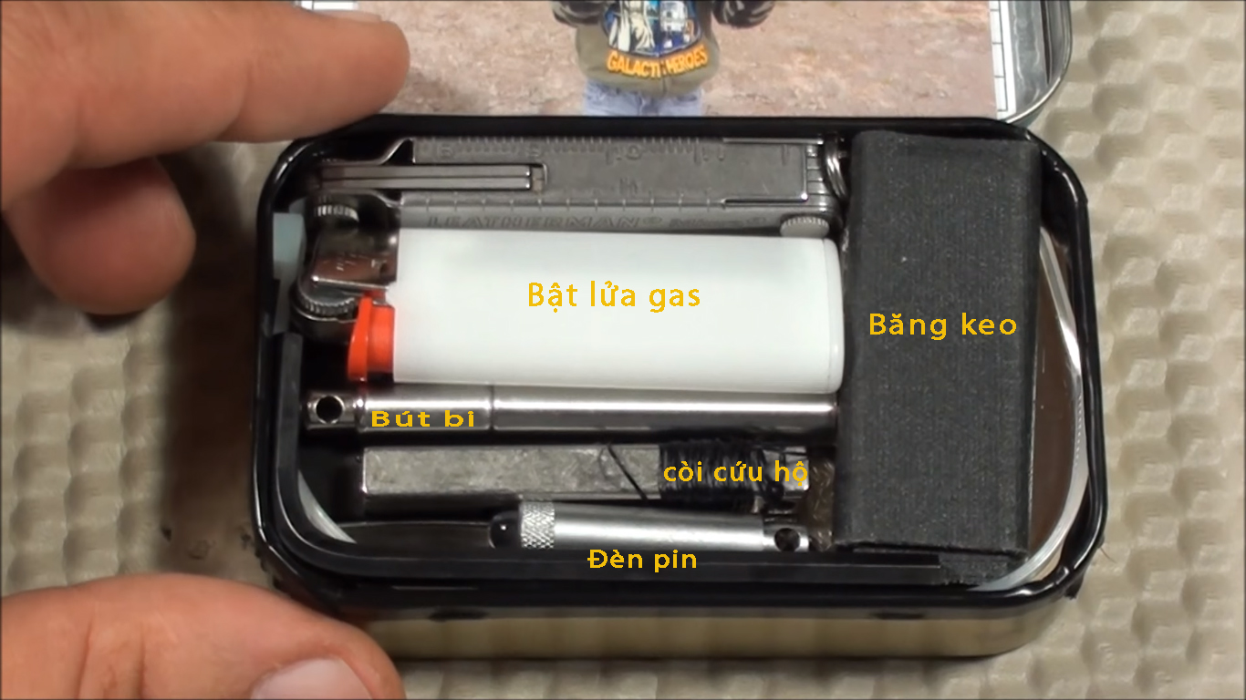 Đến đây, bạn nên xếp các dụng cụ trên vào trước, xếp sao cho hợp lí và tận dụng tối đa diện tích chiếc hộp. Đáp ứng được tiêu chí đầy đủ và gọn nhẹ.