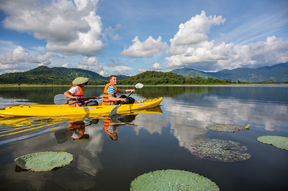 Du khách chèo thuyền trên hồ Lắk.