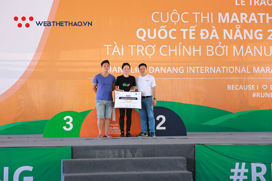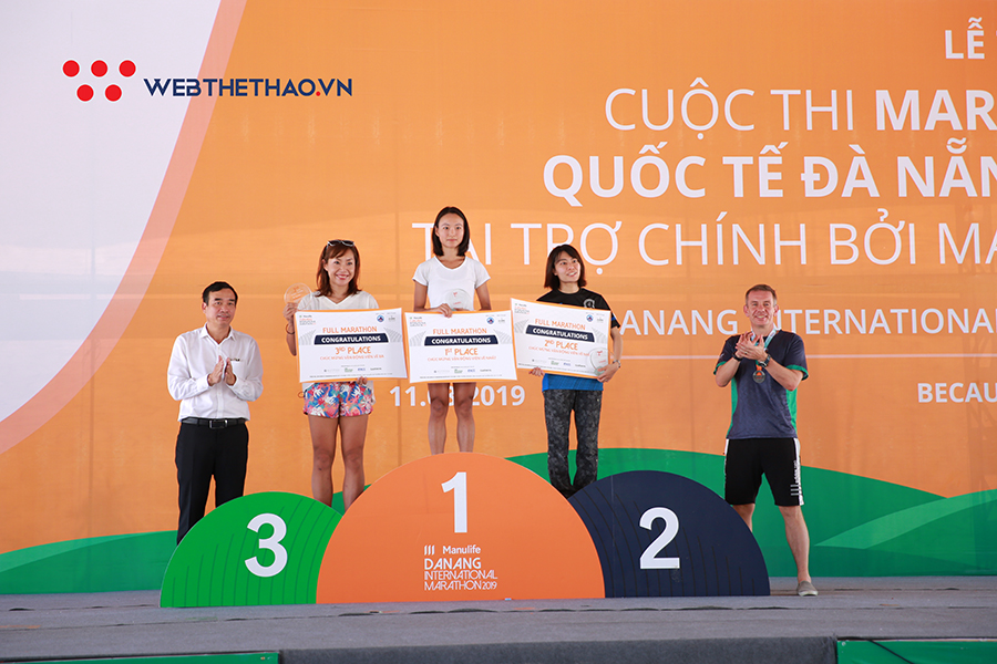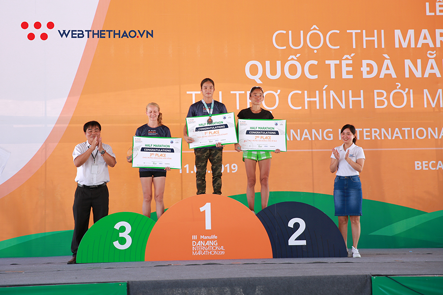 Lương Hồng Phi nhận danh hiệu vô địch nữ 10km Manulife Danang International Marathon 2019 trong khi hai vận động viên còn lại vắng mặt tại lễ trao giải