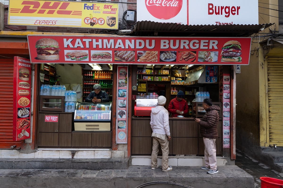 Hai người đàn ông đang đợi mua bánh hamburger trên phố. Cuối năm 1997, các doanh nhân đã thực hiện ước mơ mở chuỗi thức ăn nhanh quốc tế đầu tiên tại nước này, tiên phong là tập đoàn khách sạn Shangrila.