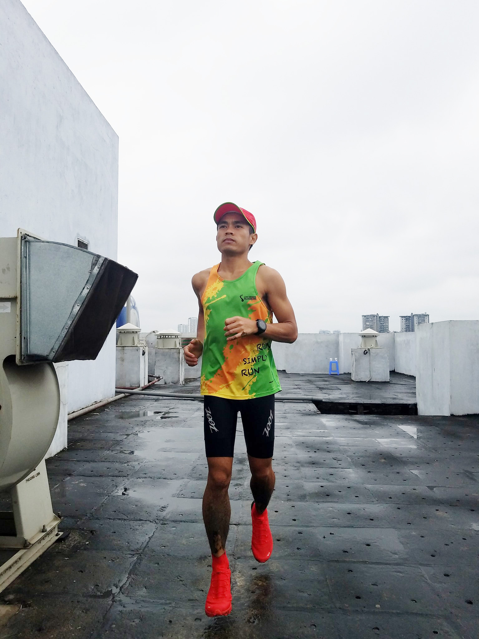 Để chuẩn bị cho thử thách này, Nguyễn Tiến Đạt đã chuẩn bị 4 chiếc áo (thay sau 10km), 1 đôi giày trail vì sân thượng ít người lên rêu trơn, dép ysandal (chạy khoảng 15km)