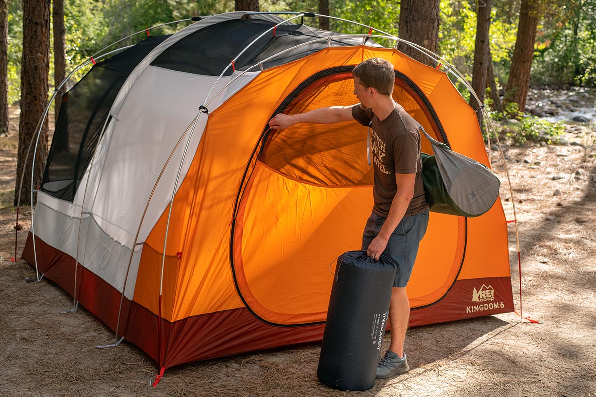 Chiếc lều Kingdom 6 tiếp tục giữ vững vị trí của mình thêm một năm nữa. Nó rất rộng rãi và thoải mái. Thiết kế mái vòm đem lại rất nhiều diện tích hơn là một chiếc lều tiêu chuẩn thông thường. Đáng ngạc nhiên đó chính là khả năng chịu gió và đứng vững trong những con mưa xối xả. Với chiều cao 1.9 mét bên trong, hầu hết người trưởng thành có thể đi lại xung quanh, giữa hai phòng tách biệt. Một phòng hầu hết là bằng vải lưới trong khi phòng kia được làm từ vải lều chắc chắn, cho phép người cắm trại chọn mức độ thông thoáng mà họ muốn, và cũng cho phép một vài sự riêng tư ngay cả khi bạn không căng tấm che lên trên lều - một sự lựa chọn tuyệt vời cho những đêm nóng bức. Chúng tôi thích Kingdom 6 từ đầu đến cuối, bao gồm cả chiếc túi đựng được thiết kế như một chiếc ba lô. Và nếu bạn cần chiếc lều Kingdom to hơn, hãy thử tìm REI Kingdom 8.