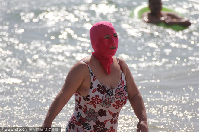 Thời gian gần đây, dân mạng đã được nhiều phen phì cười với những bộ trang phục đi biển hài hước có tên facebikini. Loại áo tắm này bao gần trọn phần cơ thể, chỉ để lộ mắt. Dù có thiết kế kỳ dị, facebikini vẫn được một bộ phận ưa chuộng vì tránh nắng tối đa, họa tiết đa dạng. Ảnh: Cfp.