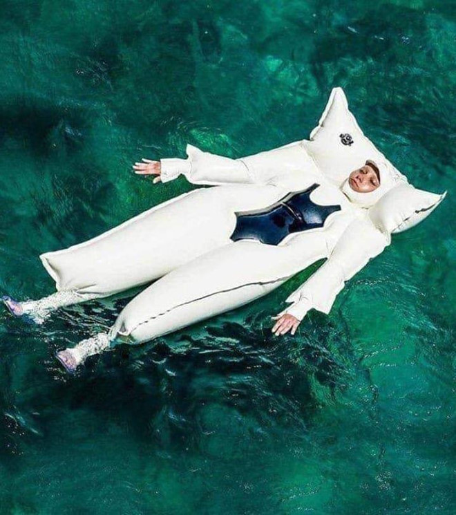 Facebikini có lẽ còn chào thua bộ áo phao "người ngoài hành tinh" đang gây sốt trên mạng vài ngày qua. Nhiều người cho rằng đã mặc chiếc áo này thì sóng thần cũng phải chào thua. Ảnh: Twitter.