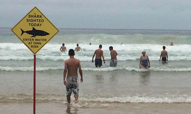 Dù có biển cảnh báo cá mập nguy hiểm, nhiều người vẫn ngó lơ để xuống tắm biển. "Cảnh tượng này nếu xuất hiện trong một bộ phim Hollywood chắc sẽ có nhiều thứ để coi", tài khoản Frankie bình luận về độ liều của những người trong ảnh. Ảnh: Daily Mail.