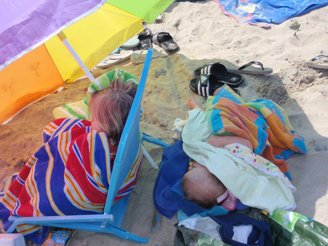 Bức hình "phân biệt đối xử" giữa hai em bé cũng khiến dân mạng bất ngờ. Chiếc ô vẫn che hết nắng cho em bé bên tay phải. Tuy nhiên, sức nóng của cát khiến người lớn cũng khó có thể nằm ngủ chứ chưa nói tới trẻ em. Ảnh: 4bp.