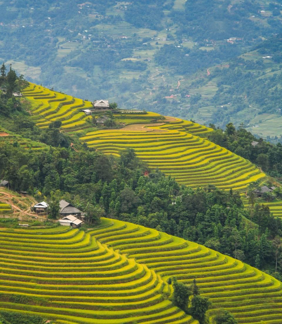 Có người ví von Mù Cang Chải mùa gặt như nấc thang vàng lên thiên đường, có người lại ca ngợi nó như những phím đàn trời lộng lẫy. Từng lớp, từng lớp sóng vàng bát ngát, trải dài từ dưới thung lũng lên sườn núi rồi vươn đến đỉnh cao chót vót mờ sương. Những dải màu chuyển sắc từ xanh đậm, vàng mơ, vàng rực đến vàng nâu cứ như một dải lụa óng ánh trong nắng.