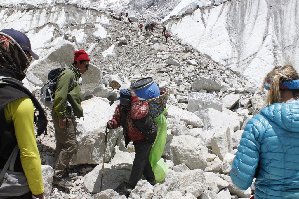 Từ lâu, chất thải của người trên đỉnh Everest không hề được xử lý và đều được những công nhân khuân vác bản địa đưa xuống núi trong những chiếc thùng màu xanh.