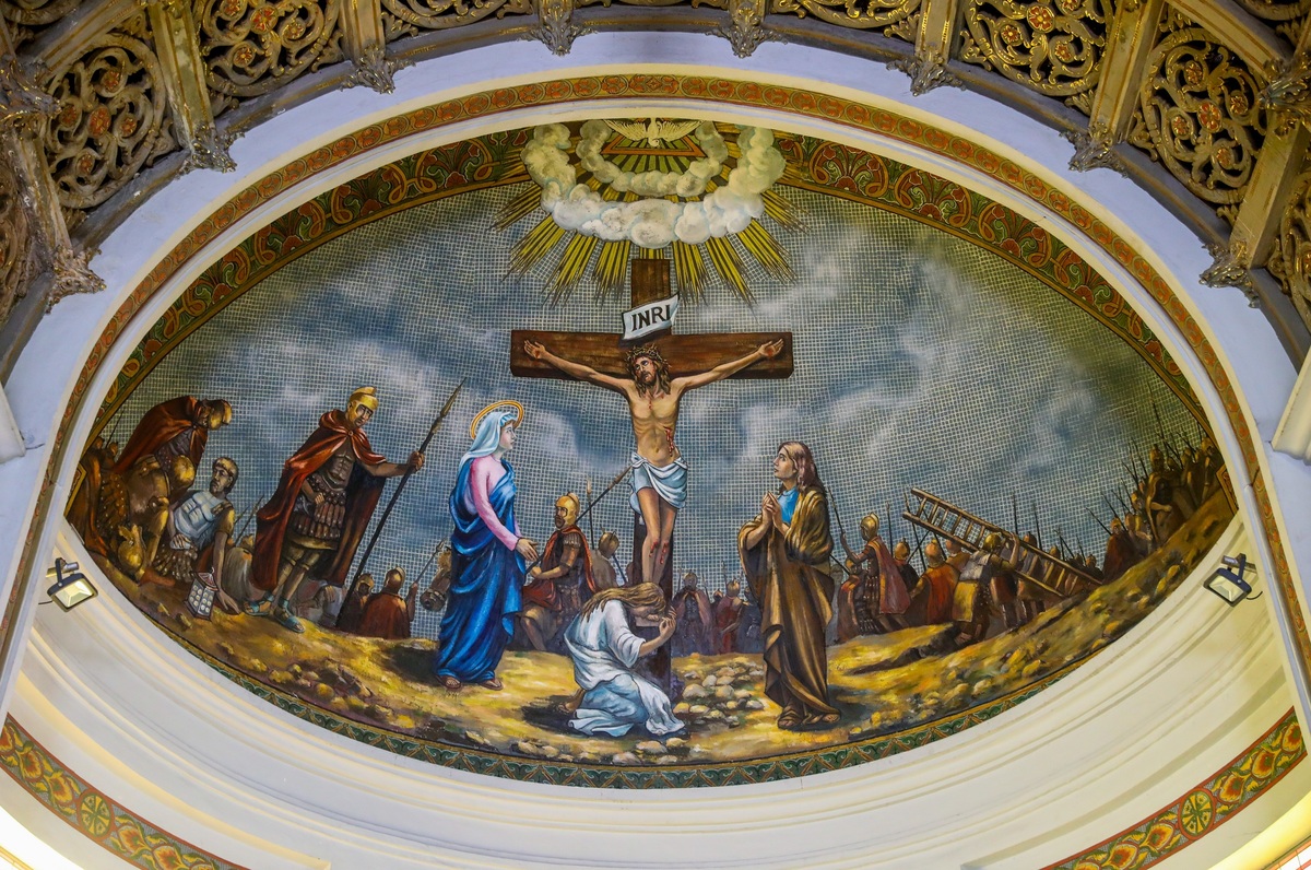 Trên vòm của cung thánh được trang trí tranh khảm theo phong cách Byzantine mô tả cảnh Chúa Giesu trên thập giá cùng một số hình ảnh các vị thánh khác.