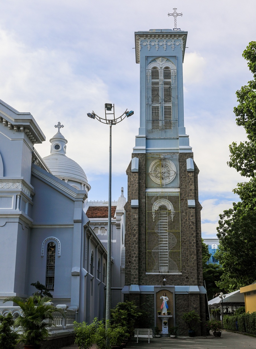 Tháp chuông nhà thờ được ghép bằng đá vững chãi, phía trên đỉnh đặt ba quả chuông đúc năm 1925. Vì nằm gần sân bay Tân Sơn Nhất nên tháp chuông ban đầu cao 30 m, năm 1952 giảm xuống còn 19,5 m để đảm bảo an ninh hàng không.