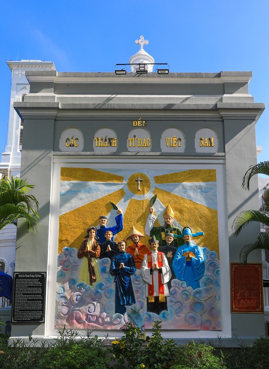 Mặt sau cùng của nhà thờ tạc phù điêu đắp nổi các thánh tử đạo của Việt Nam.