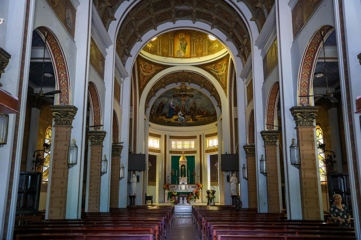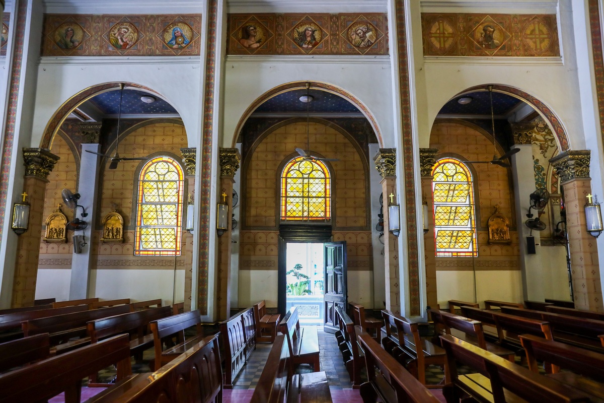 Những hàng cột trong thánh đường kiểu vòm cung, thiết kế đối xứng nhau. Xen lẫn giữa các ô cửa sổ kính màu là những bức phù điêu được thếp vàng kể lại từng chặng đường khổ nạn mà Chúa Giesu đã trải qua.