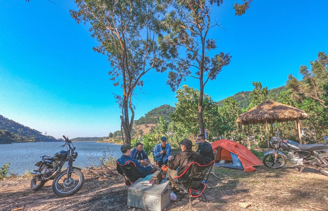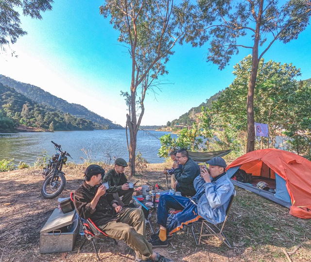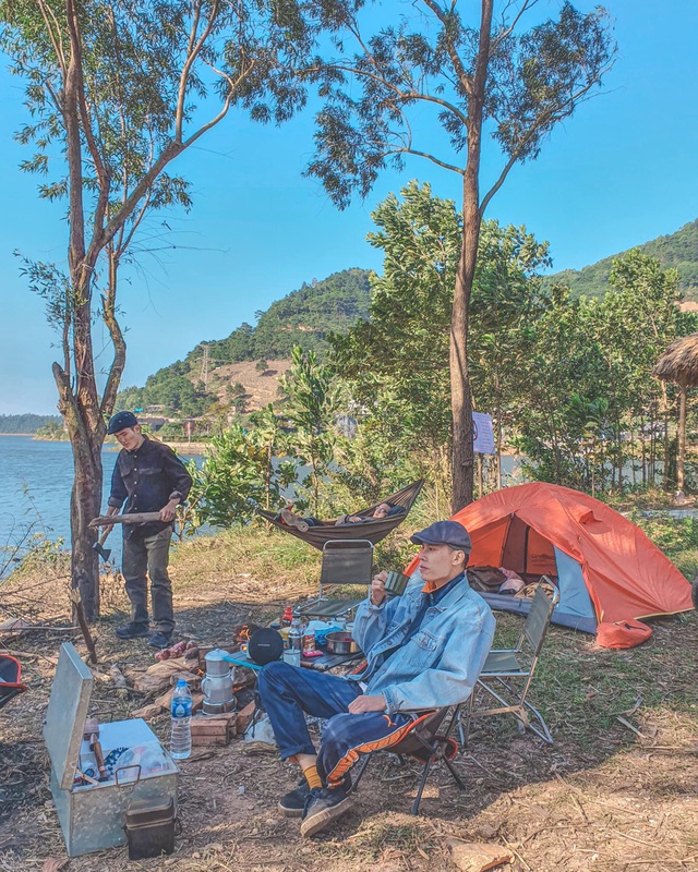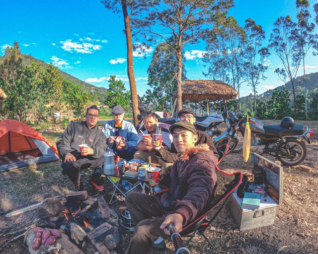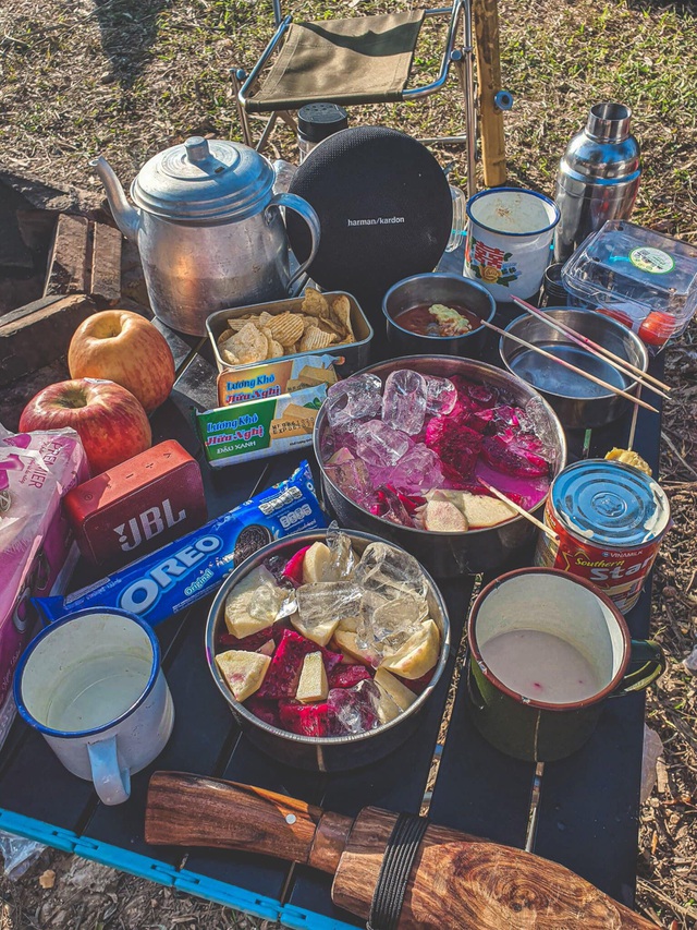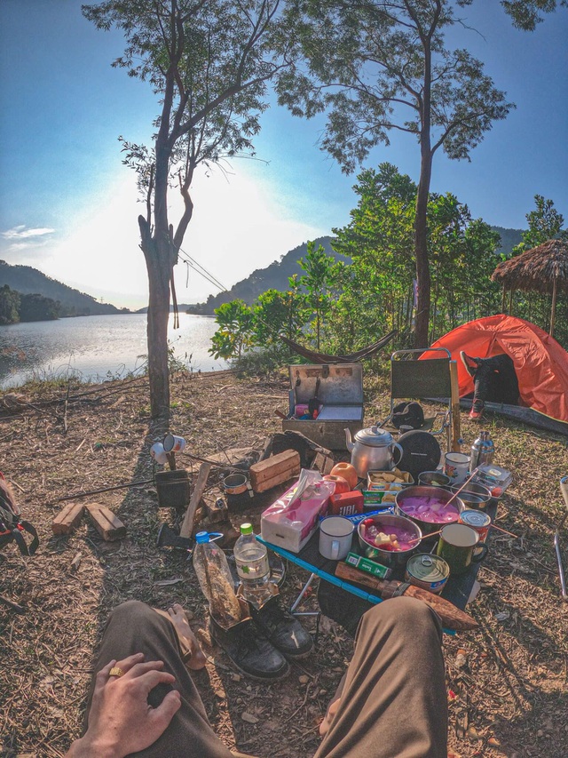 Vì nơi đây là địa điểm khám phá còn mới mẻ nên vẫn giữ được vẻ yên bình, tĩnh lặng. Nhóm của Huy dựng lều, đặt bàn và chuẩn bị "đồ nghề" cho bữa ăn. Ngoài mì tôm cốc, bánh trái, nước uống mang đi từ nhà, nhóm còn gom củi, đốt lửa để luộc trứng, nướng khoai.