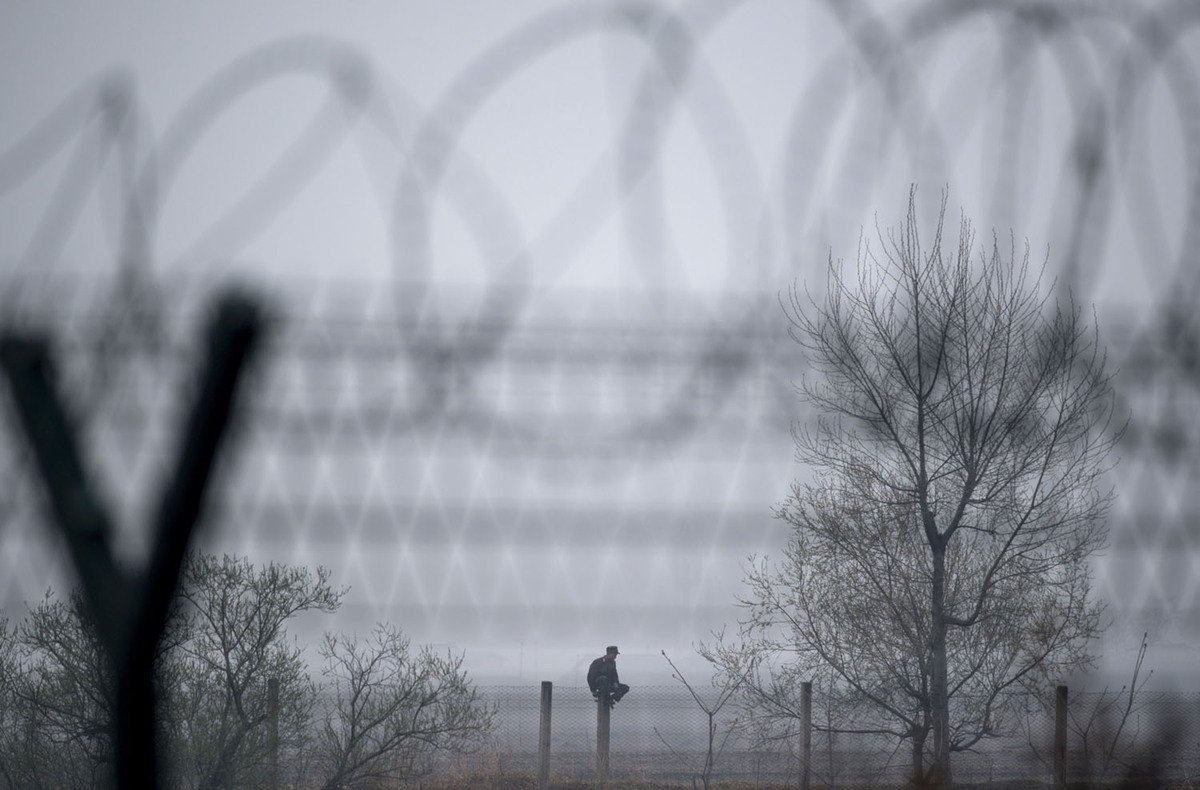 Người lính Triều Tiên ngồi trên hàng rào gần thành phố Sinuiju giáp với vùng Đan Đông của Trung Quốc. Việc du lịch Triều Tiên đã trở nên dễ dàng hơn trong những năm gần đây dù nước này vẫn duy trì nhiều quy định khắt khe với du khách như luôn phải có hướng dẫn viên đi kèm khi tham quan, không chụp ảnh quân đội và các công trình quân sự…
