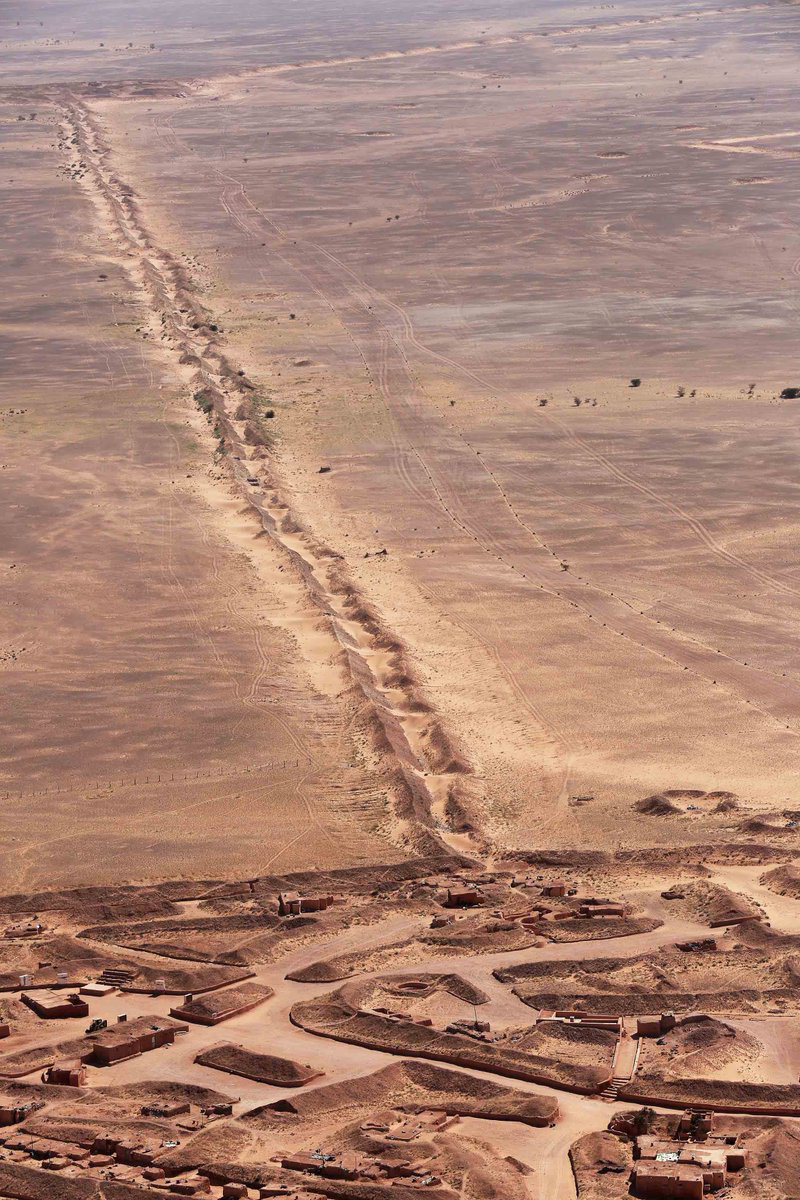 Bức ảnh chụp từ trên không một đoạn của Bức tường Tây Sahara Morocco, công trình dài khoảng 2.700 km chủ yếu làm từ cát chạy qua vùng phía tây Sahara và tây nam Morocco, phân chia vùng tự do và vùng chiếm đóng với lịch sử phức tạp. Các bức tường đá và cát cao khoảng 3 m cùng hố cát, hàng rào và mìn bố trí dọc theo chiều dài khu vực tranh chấp này.