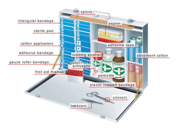 Bạn cũng cần phải biết nên chuẩn bị những gì trong bộ đồ ấy. Bạn cần nước muối sinh lý để rửa vết thương, kháng sinh ở dạng thuốc mỡ bôi, cồn, oxy già, thuốc giảm đau, thuốc giảm độ acid, aspirin và thuốc kháng histamin để chống dị ứng. Bạn cũng cần phải có kẹp, gạc, băng cá nhân và thuốc nhỏ mắt. Nếu bạn bị dị ứng với một số dị nguyên như vết ong đốt..., thì hãy chắc chắn bên cạnh bạn luôn có thuốc giải của nó. Ngoài ra, hãy mang theo các loại kem có chứa hydrocortisone đề phòng phát ban hay mẩn ngứa, và thuốc mỡ để dùng khi bị bỏng. Và để chắc chắn hơn nữa, bạn hãy mang theo cuốn sổ tay hướng dẫn những gì phải làm khi gặp tình huống khẩn cấp.