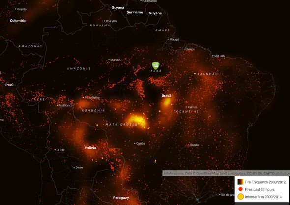 Bạn có thể nhìn thấy khói từ không gian. Các vệ tinh Sentinel của Chương trình Quan sát Trái đất của Liên minh Châu Âu đã chụp được những hình ảnh về "lượng khói đáng kể" trên các bang Amazonas, Rondonia và các khu vực khác.