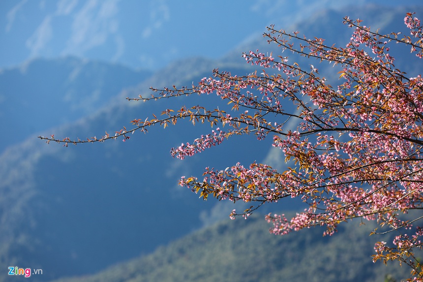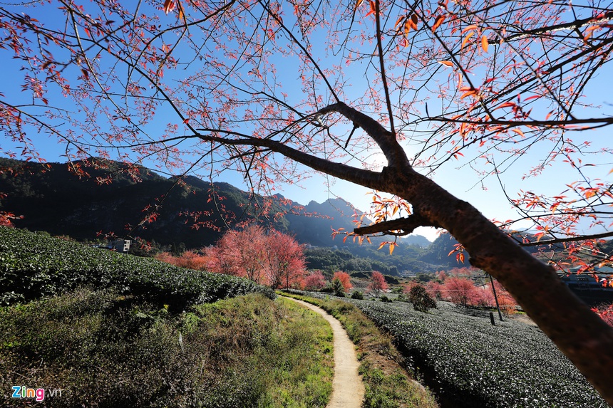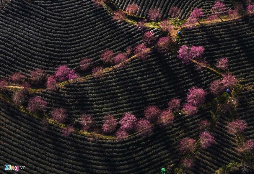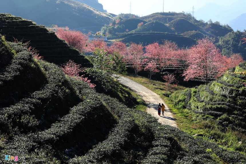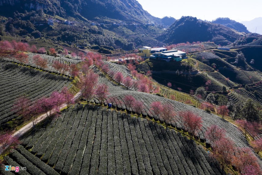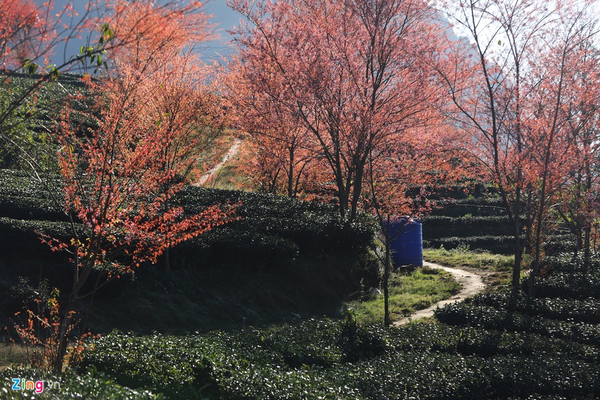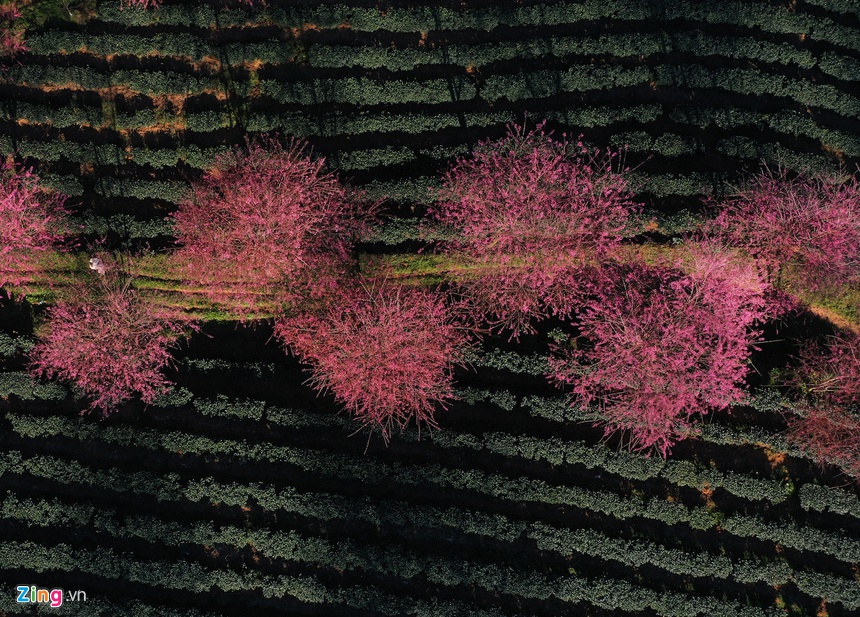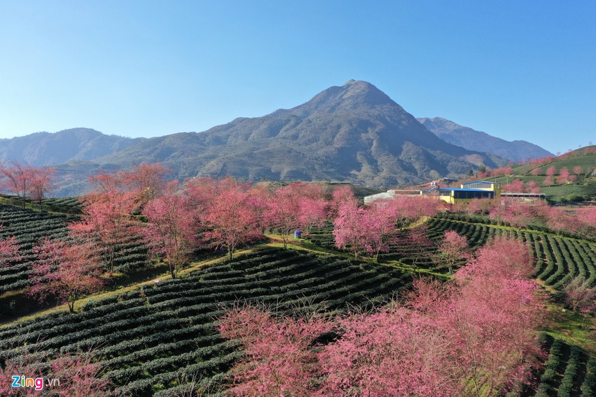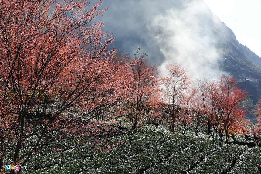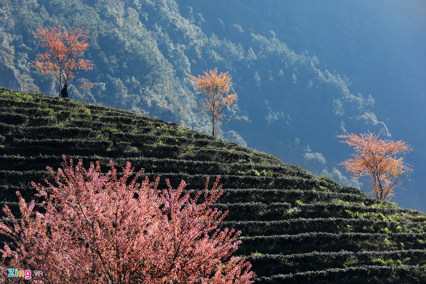 Những ngày này, các đồi chè và vùng núi ở Sa Pa (Lào Cai) hiện lên nhiều mảng màu sắc rực rỡ khi hoa mai anh đào nở rộ chuẩn bị đón xuân.
