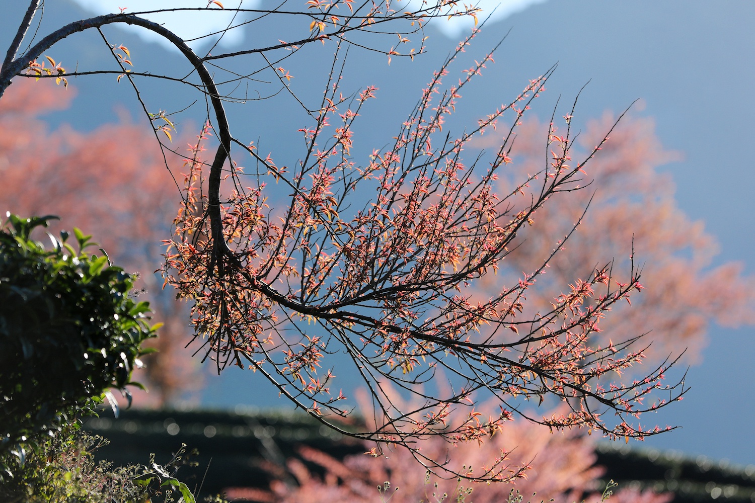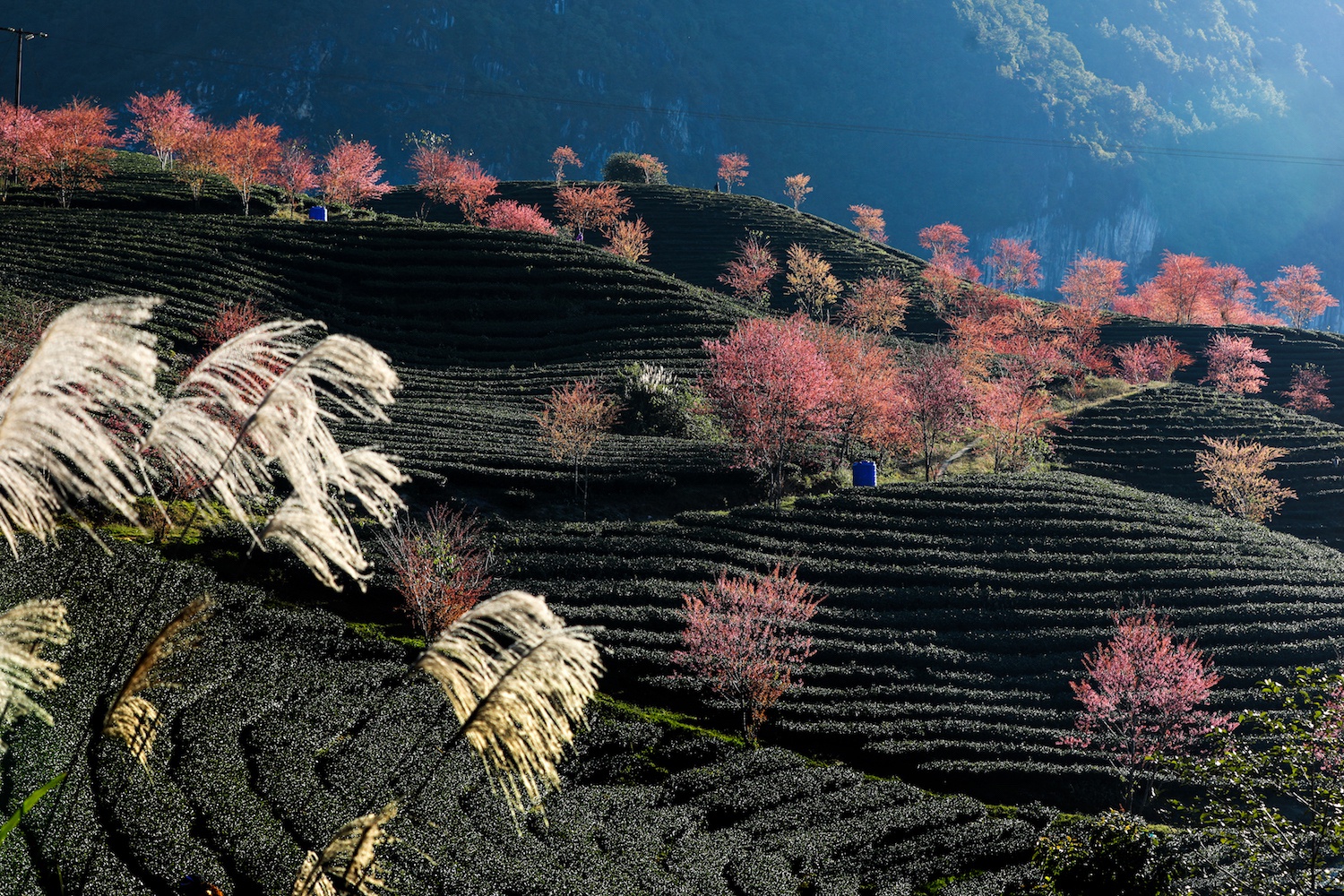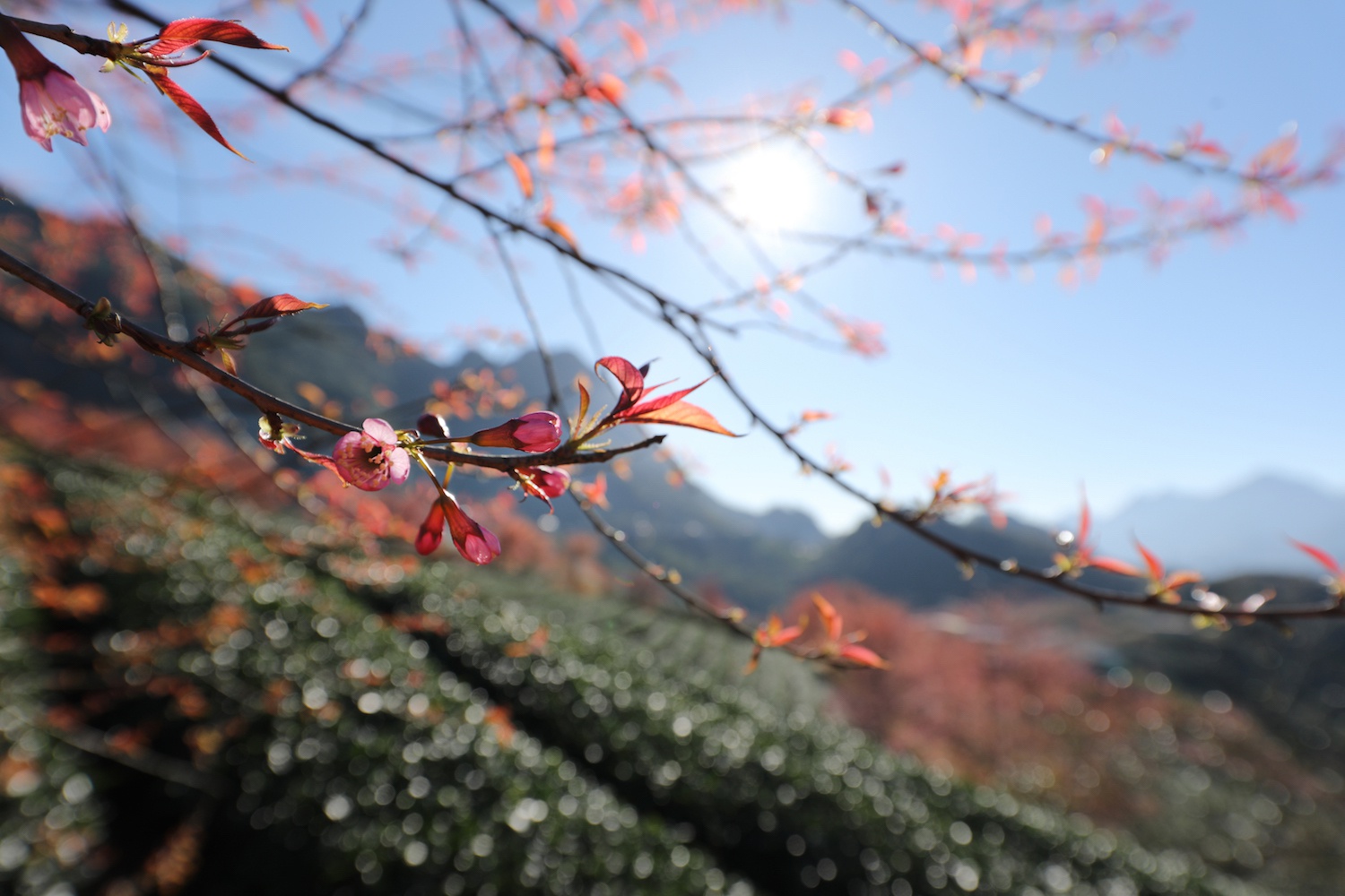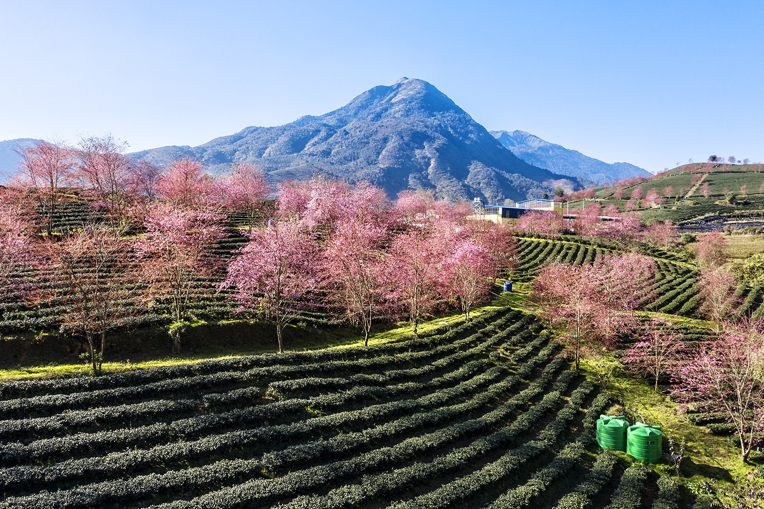 Những ngày này, các đồi chè và vùng núi ở Sa Pa (Lào Cai) hiện lên nhiều mảng màu sắc rực rỡ khi hoa mai anh đào nở rộ chuẩn bị đón xuân.