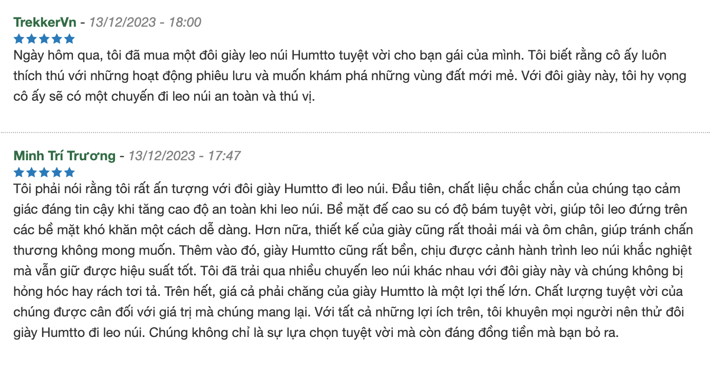 Nếu bạn còn phân vân về chất lượng của giày leo núi HUMTTO WeTrek, hãy cùng điểm qua một số phản hồi của khách hàng đã trải nghiệm sản phẩm này của WeTrek: