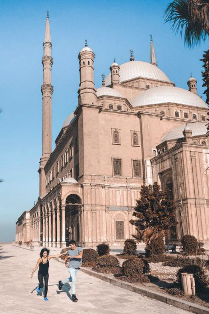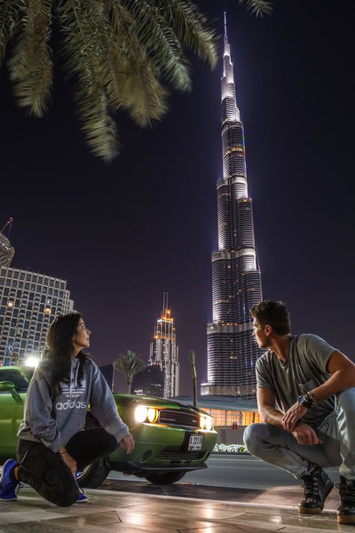 Cặp đôi chụp ảnh trước tòa nhà cao nhất thế giới, Burj Khalifa ở Dubai (UAE) trong điểm dừng chân châu Á