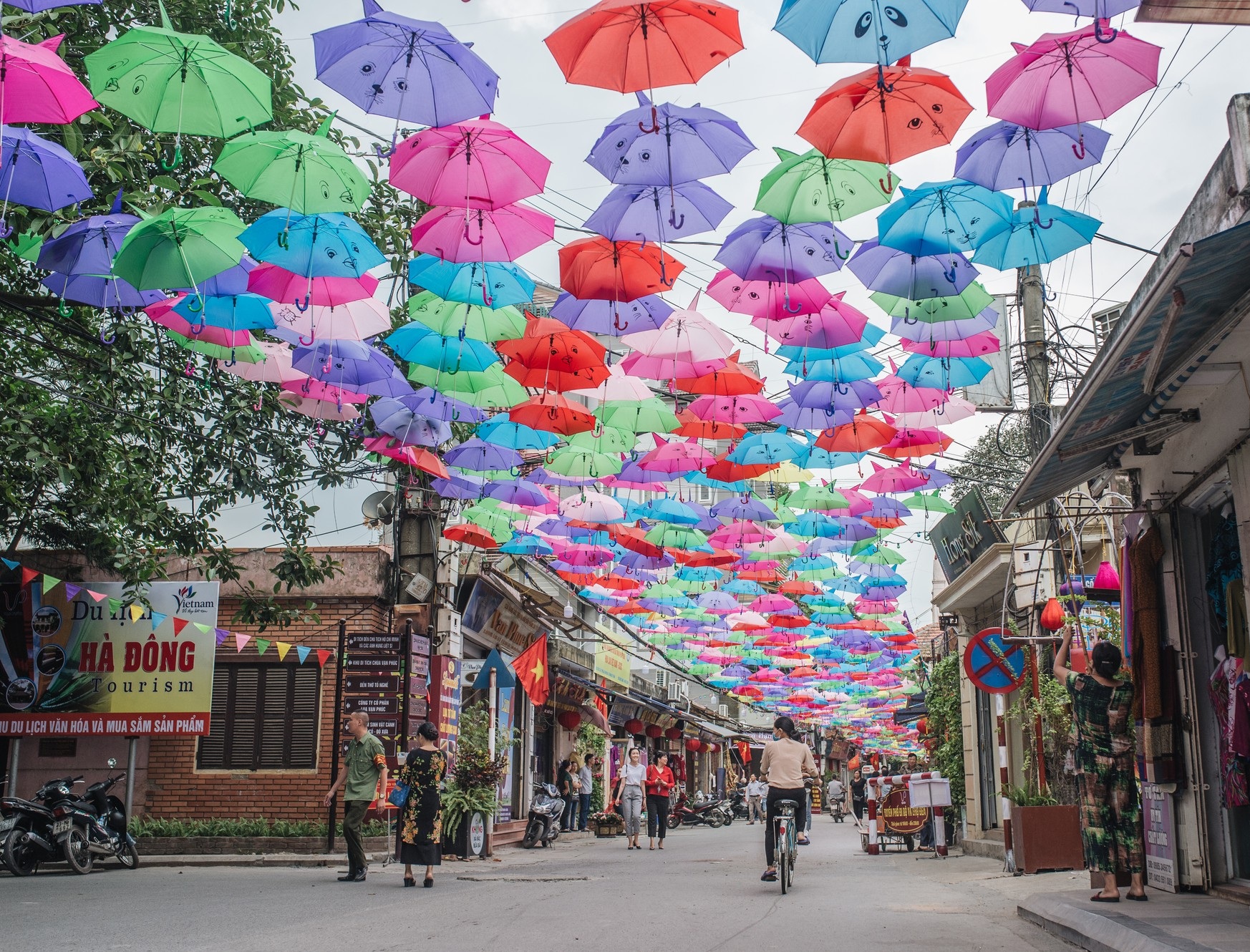 Chẳng cần phải đi đâu xa, ngay trong nội thành Hà Nội, bạn có thể tha hồ check-in trong không gian với hàng nghìn chiếc ô rực rỡ tại Làng lụa Vạn Phúc. Đây là làng nghề có tuổi đời trên 1.000 năm tuổi.
