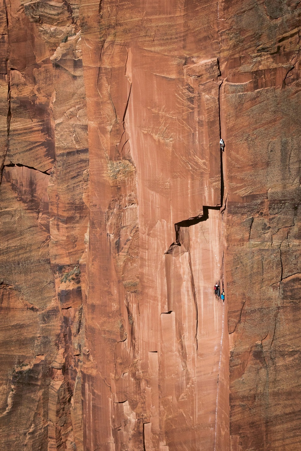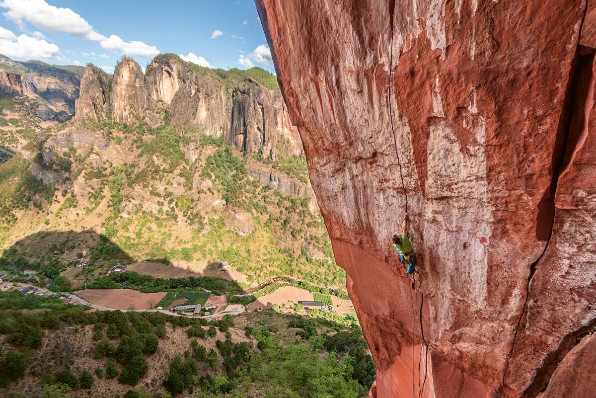 Nhà leo núi Logan Barber đu mình trên bức tường sa thạch màu đỏ Firewall thuộc tỉnh Vân Nam, Trung Quốc. Firewall cao 180 m, là một trong hai tuyến leo núi mạo hiểm nhất của nước này.