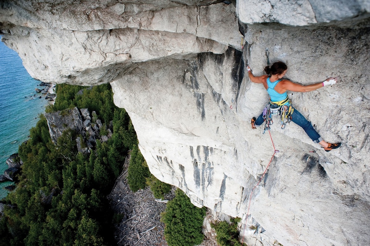 Nhà leo lúi Leslie Timms đang chinh phục vách đá Lion’s Head ở Niagara Escarpment thuộc thành phố Ontario, Canada. Niagara Escarpment có cảnh quan tuyệt vời, trải dài 725 km, bao phủ diện tích 1.923 km2 và có điểm vách đá dựng đứng cao khoảng 335 m.