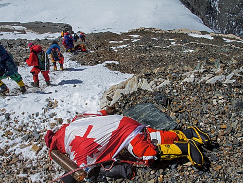 Thi thể của nhà leo núi Shriya Shah–Klorfine được quấn trong lá quốc kỳ Canada. Cô đã chinh phục thành công đỉnh núi nhưng không thể lành lặn trở về. Hiện thi thể của Shriya đã được đưa về quê nhà an táng.