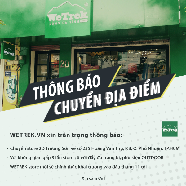 Với mong muốn được chăm sóc quý khách tốt hơn, chu đáo và chuyên nghiệp hơn. Đáp ứng nhu cầu của Quý khách để dễ dàng và thoải mái hơn khi mua sắm trang phục, thiết bị Outdoor, WETREK.VN xin chính thức thông báo đóng cửa showroom tại 2D Trường Sơn, đồng thời thông báo khai trương showroom mới tại số 235 Hoàng Văn Thụ, P.8, Q. Phú Nhuận, TP.HCM. Đây sẽ là địa điểm mua sắm rộng rãi, mặt đường lớn, dễ tìm hơn cho quý khách hàng.