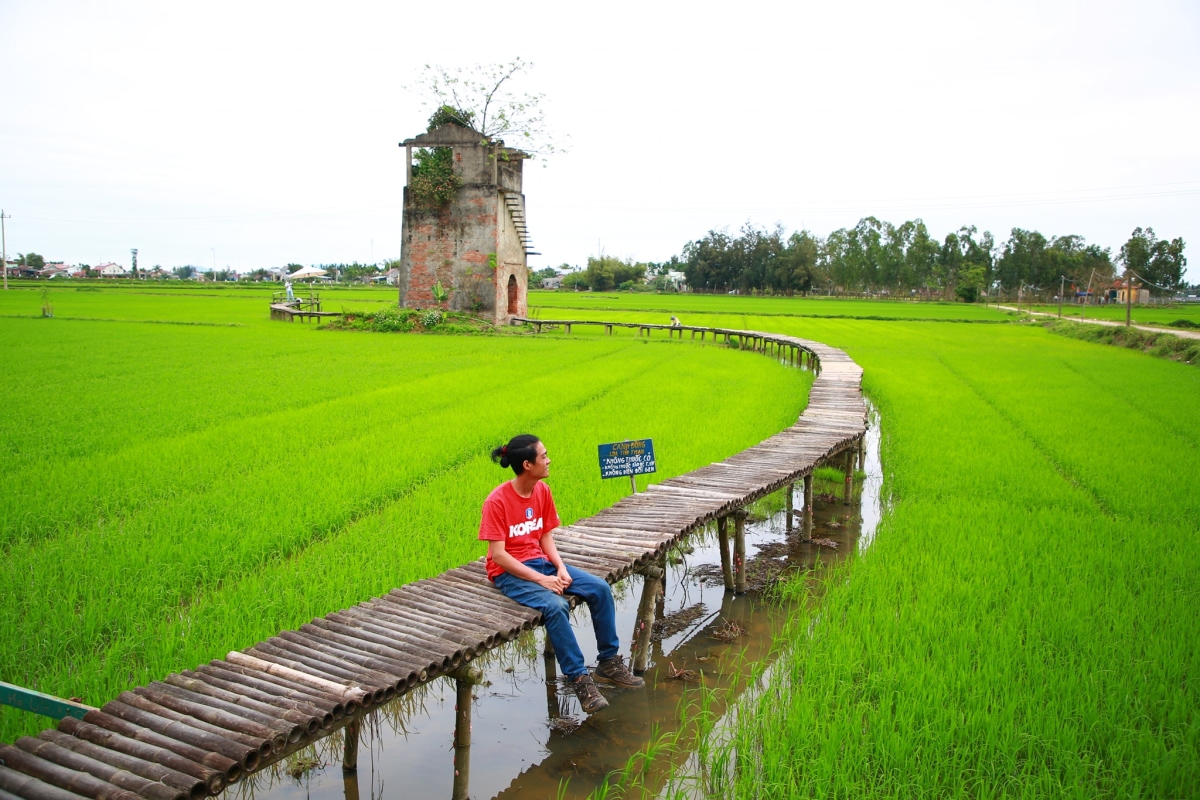 Thanh Tuấn check-in bên lò gạch cũ, nằm giữa ruộng lúa bao la xã Duy Vinh, huyện Duy Xuyên, Quảng Nam. Đầu năm 2020, một người địa phương mua lại lò gạch cũ, cải tạo và phát triển loại hình du lịch nông trại. Vào những mùa khác nhau, màu xanh của lúa non, màu vàng của lúa chín hay mùa đổ nước... đều mang vẻ đẹp riêng.
