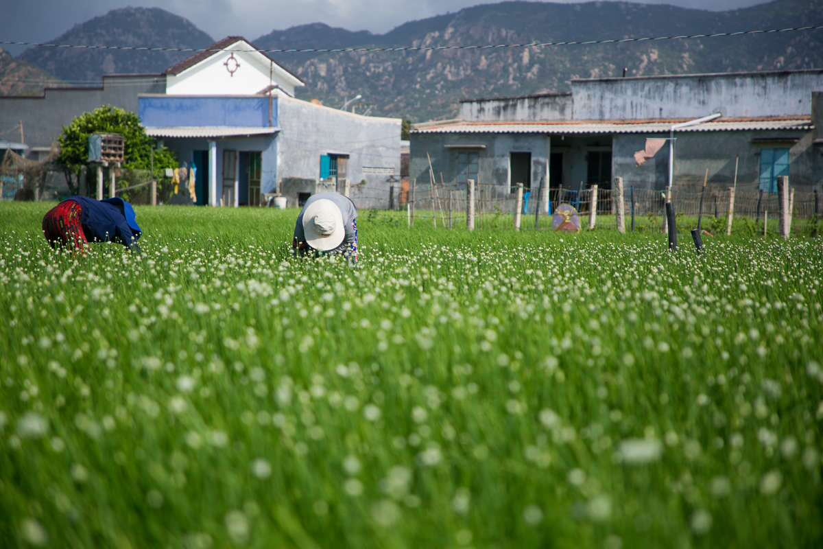 Những thửa ruộng bông hành trồng xung quanh nhà dân trên Hòn Đỏ, Ninh Thuận. Hòn Đỏ thuộc thôn Mỹ Hiệp, xã Nhơn Hải, huyện Ninh Hải, trên đây còn có rừng dương và các bãi đá rêu xanh.