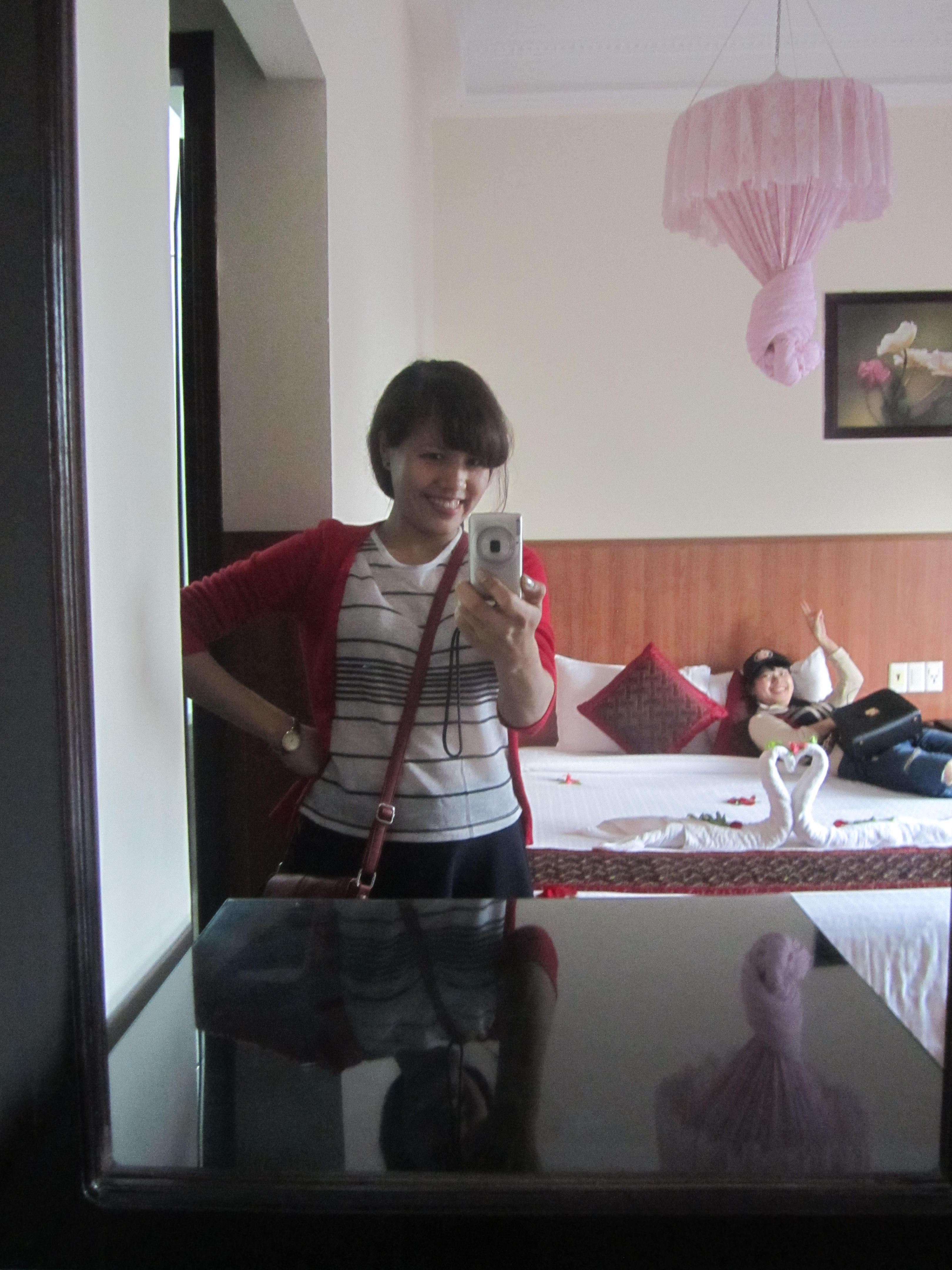 Ấn tượng vì khách sạn có ban công sắt màu đen, cái bồn tắm trắng to lắm và chẳng có 1 móc nào để treo quần áo cả. Thiết kế hơi NGU một tý. 2 chị em cười. :v