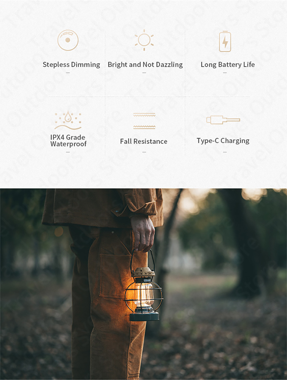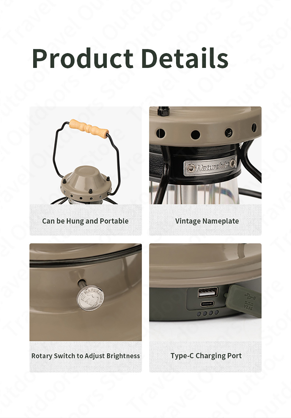 Đèn Bão Cắm Trại Cổ Điển NatureHike NH21ZM010 có chỉ số chống nước IPX4, vòng thép bảo vệ chống rơi vỡ, thời gian hoạt động tối đa tới ~65h, kiểu dáng Vintage thời trang.