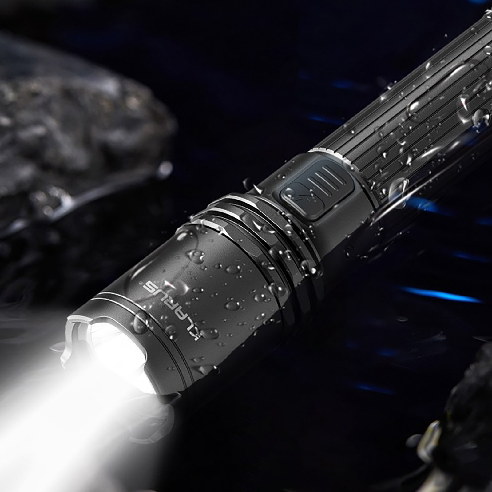 Chất liệu và thiết kế chắc chắn: Thân đèn được gia công từ hợp kim nhôm hàng không anodized HA III, đảm bảo nhẹ nhàng, bền bỉ và chống ăn mòn. Bezel đầu đèn dạng răng cứng và thiết kế đường vân chống trơn trượt, tăng khả năng cầm nắm chắc chắn.