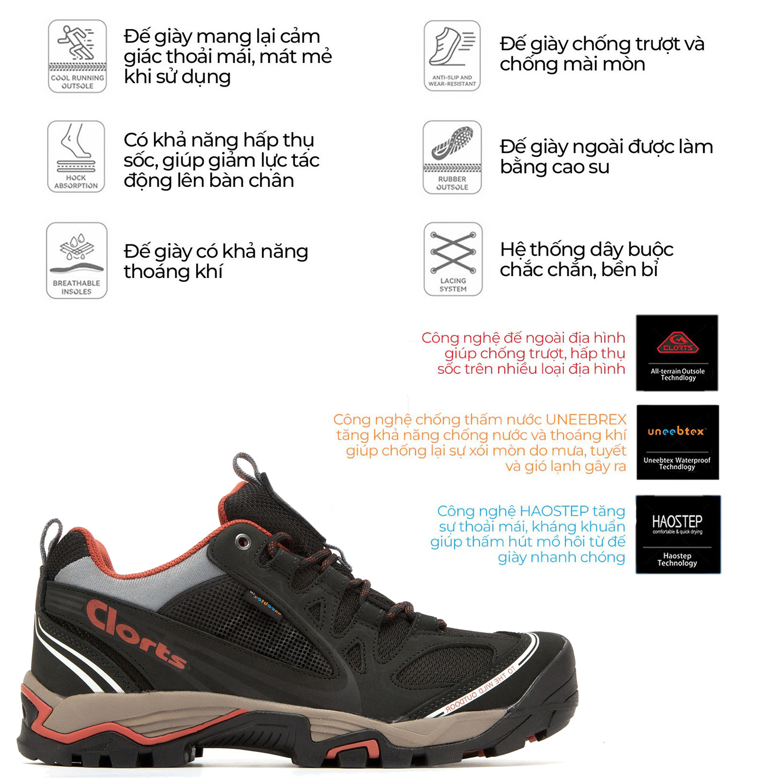Sử dụng công nghệ đế ngoài hiện đại của Clorts giúp tăng khả năng chống trượt và hấp thụ sốc trên nhiều loại địa hình.