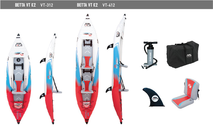 | Sản phẩm bao gồm | 1x Thuyền kayak bơm hơi 2 người Aqua Marina Betta VT K2 VT-412 - 7647 2x Ghế PVC Drop-stitch có lưng tựa 2x Đế để chân 1x Bơm tay 16” 1x Đồng hồ đo áp suất 1x Túi đựng chuyên dụng 2x Vây giữa 1x Bộ dụng cụ sửa chữa 1x Sách hướng dẫn |