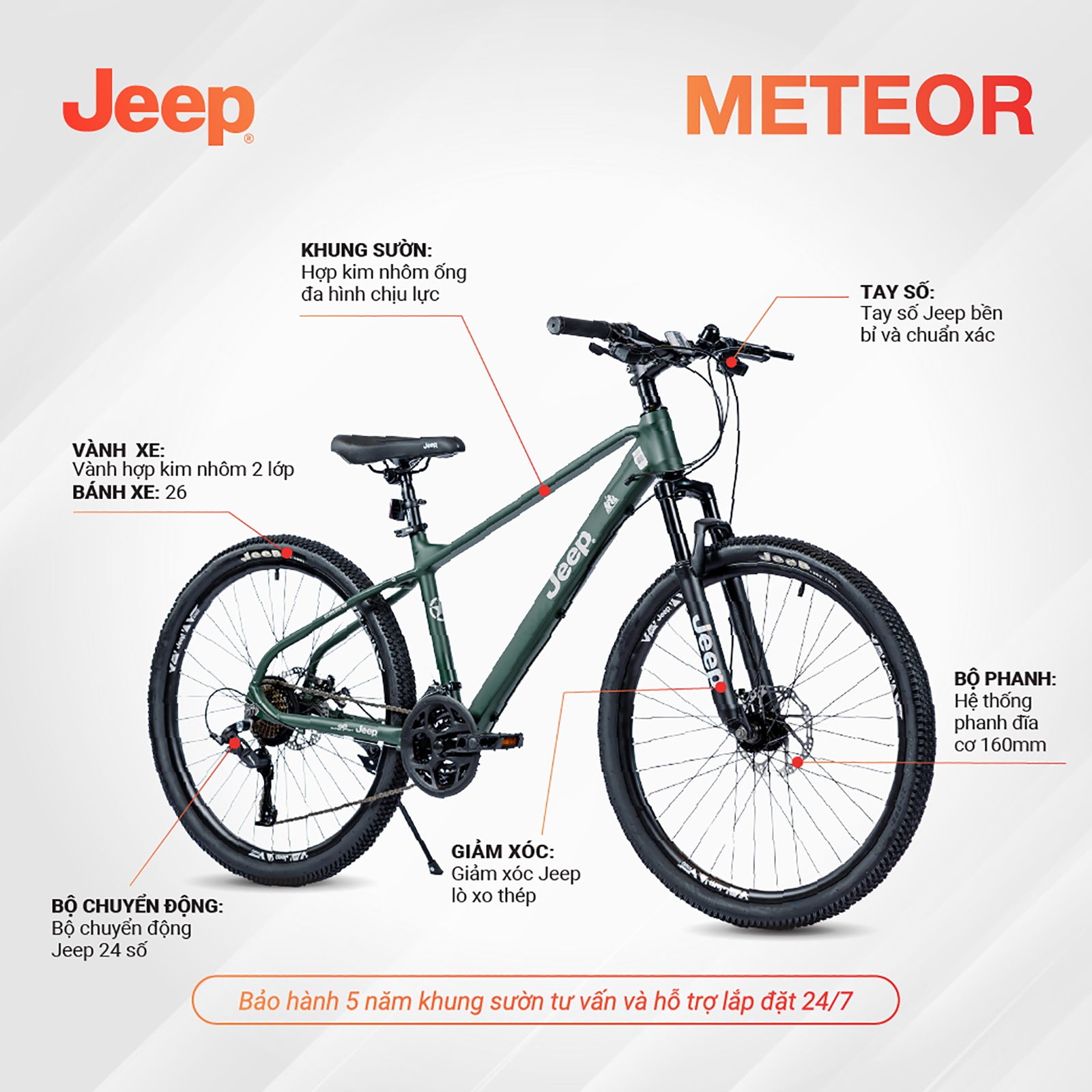 JEEP Mountain Bike Meteor là sự kết hợp hoàn hảo giữa công nghệ hiện đại và thiết kế tinh tế, mang đến trải nghiệm lái xe đỉnh cao cho những người yêu thích môn thể thao mạo hiểm. Với khả năng vượt địa hình ấn tượng, hệ thống giảm xóc mạnh mẽ và thiết kế bền bỉ, Meteor không chỉ là một chiếc xe đạp leo núi mà còn là người bạn đồng hành đáng tin cậy trên mọi hành trình khám phá.