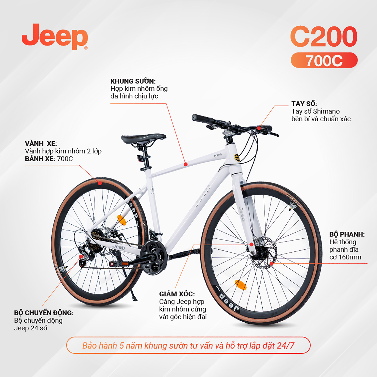 Xe Đạp Đường Phố JEEP City Touring Bike C200 là dòng xe đạp đường phố lý tưởng dành cho những ai yêu thích sự năng động và phong cách. Được thiết kế với khung hợp kim nhôm siêu nhẹ, hệ thống truyền động Shimano 24 tốc độ linh hoạt và các tính năng an toàn vượt trội, C200 mang đến trải nghiệm di chuyển thoải mái, hiệu quả và đầy thú vị.